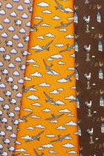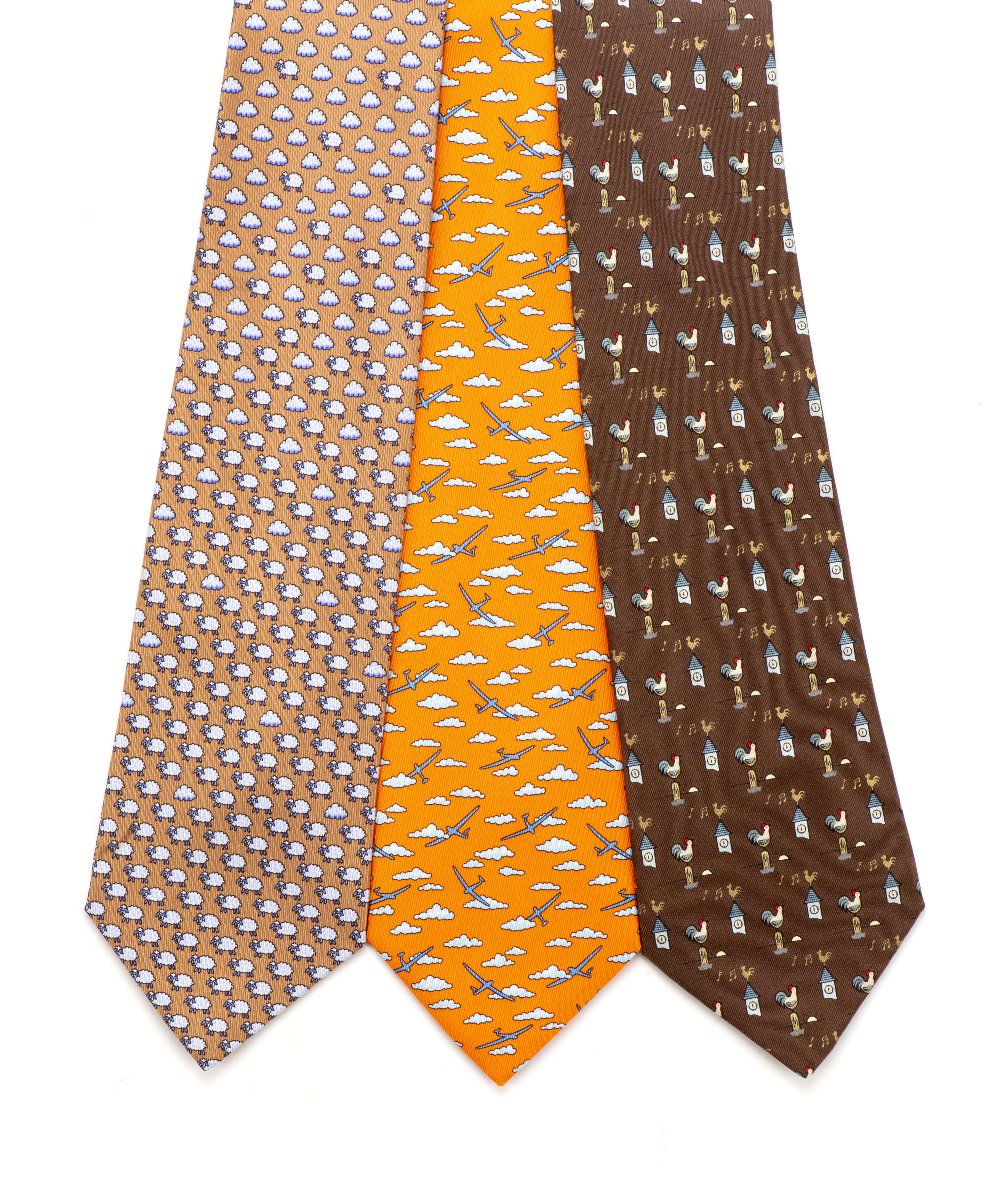 Hermès, lot de trois cravates en soie à motifs dans des tons orange, marron et moka.