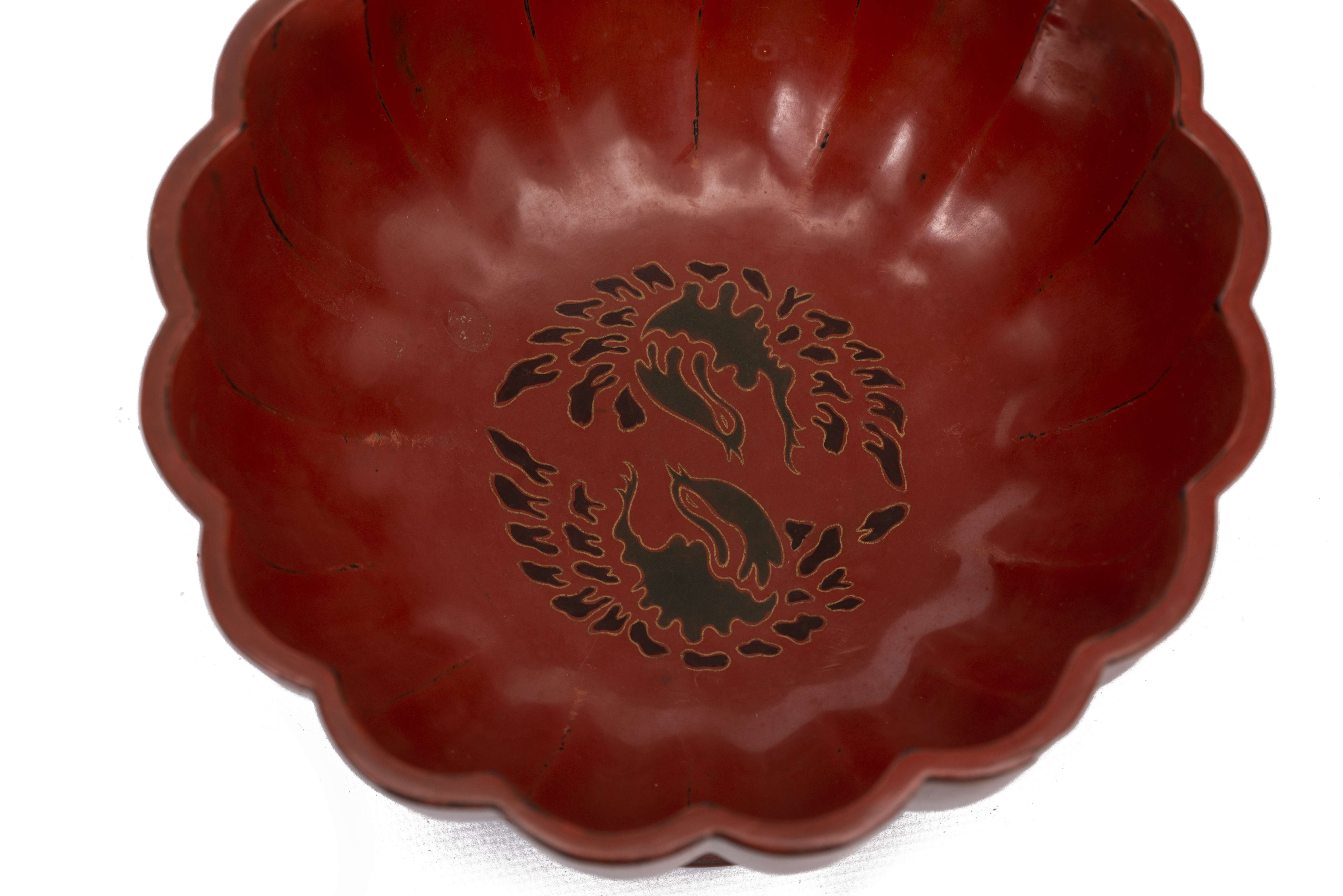 JAPON - Bol polylobé à lèvre en forme de chrysanthème du Japon à décor sur le fond de deux phénix et sur le marli extérieur de phénix et papillons. Piédouche terminé sur 3 pieds séparés par une volute en forme d'accolade. Époque Taisho, revival item.