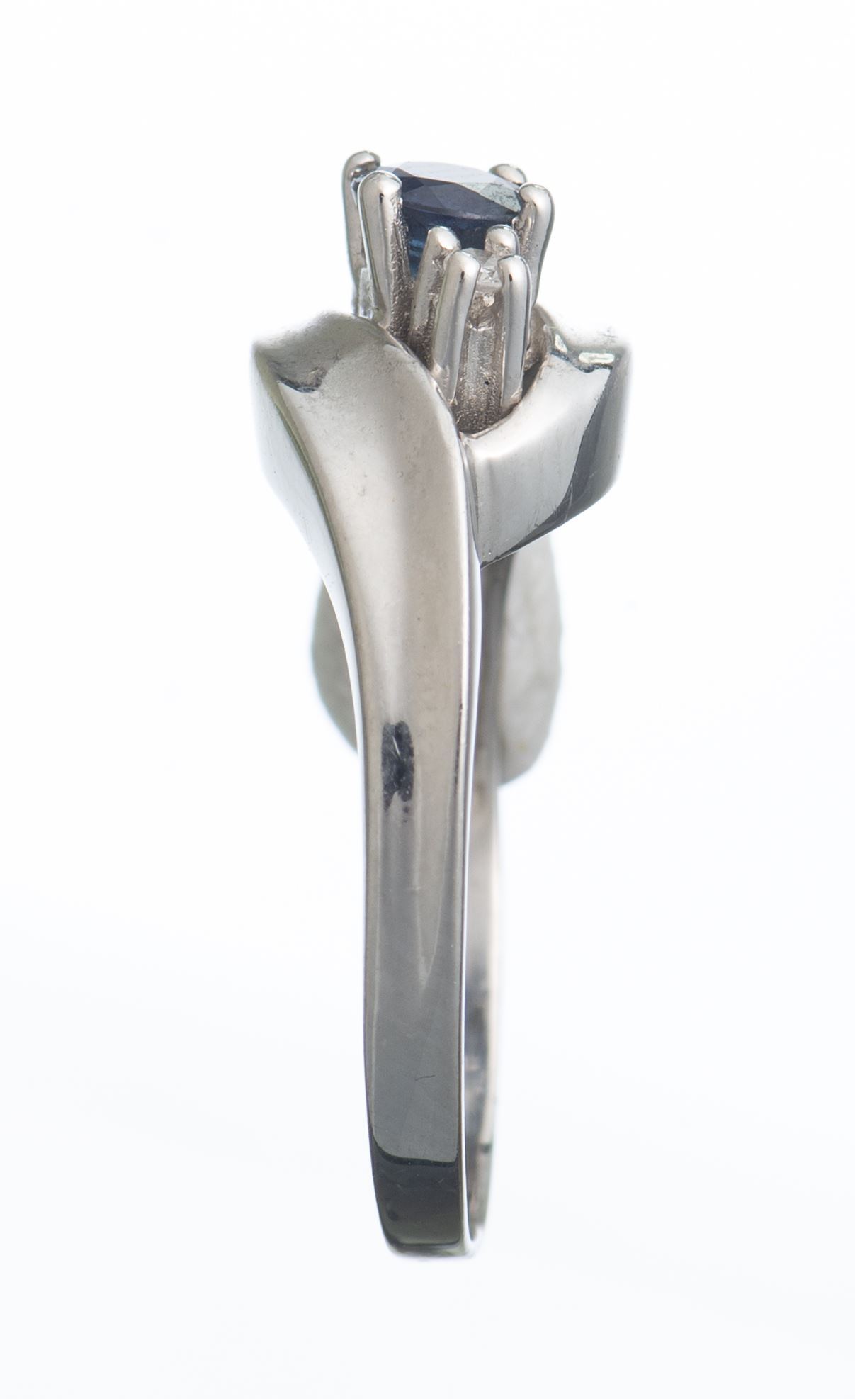 Bague en or gris sertie à 4 griffes au centre d'un saphir