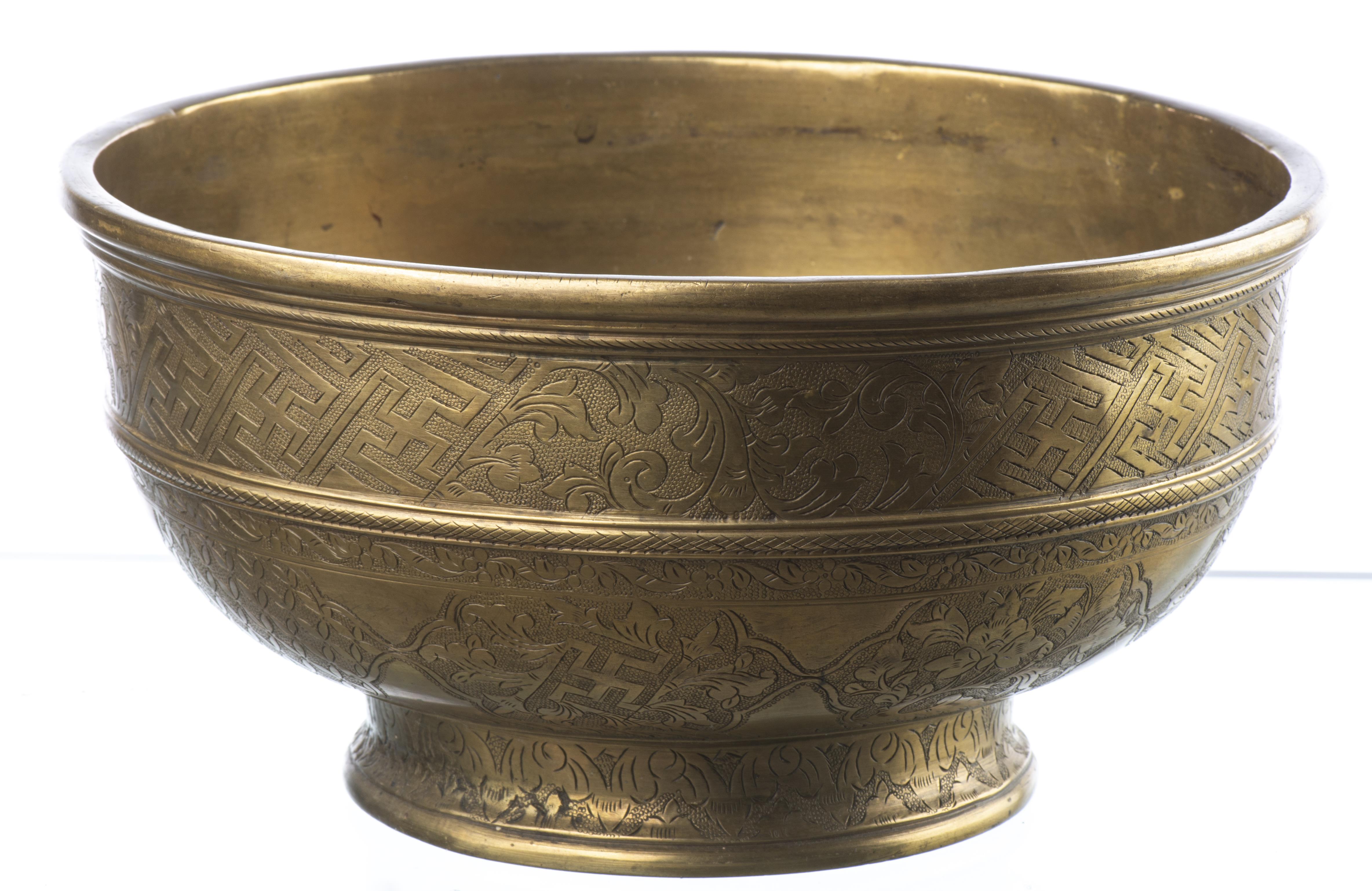 CHINE - Grand bol en métal doré à décor ciselé de fleurs et de swastikas