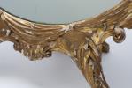 Psyché vers 1925 à miroir arrondi et encadrement en bois doré aux allures de drapé et pieds en encorbellement de feuillage.