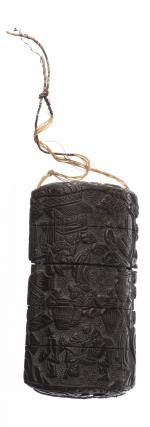 JAPON - Meiji - Inro en laque brun à décor sculpté de scènes villageoises