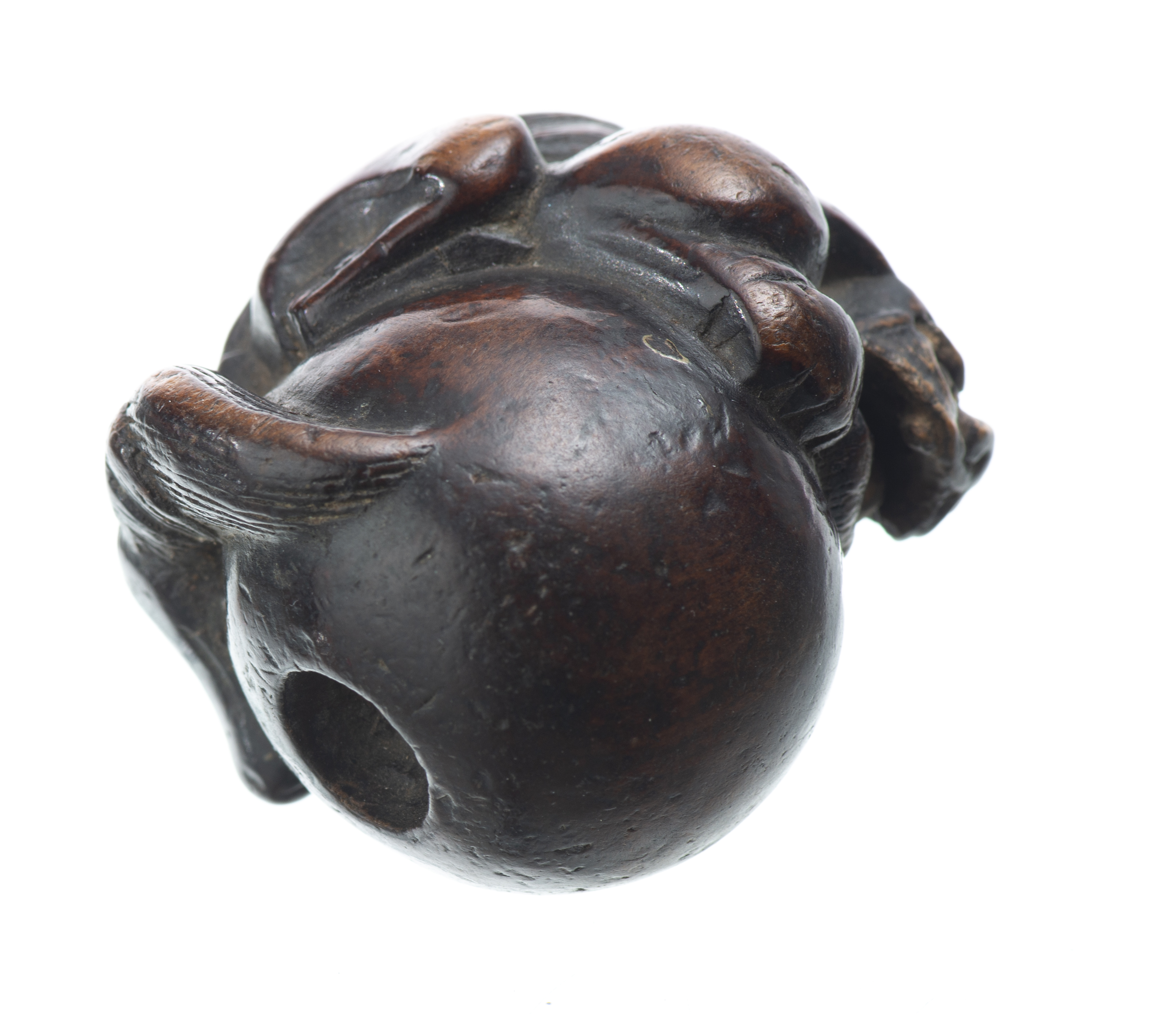 JAPON - Netsuke en bois de buis sculpté représentant un Shishi (Chien de Fô) avec une boule mobile dans la gueule, non signé. XIXe.