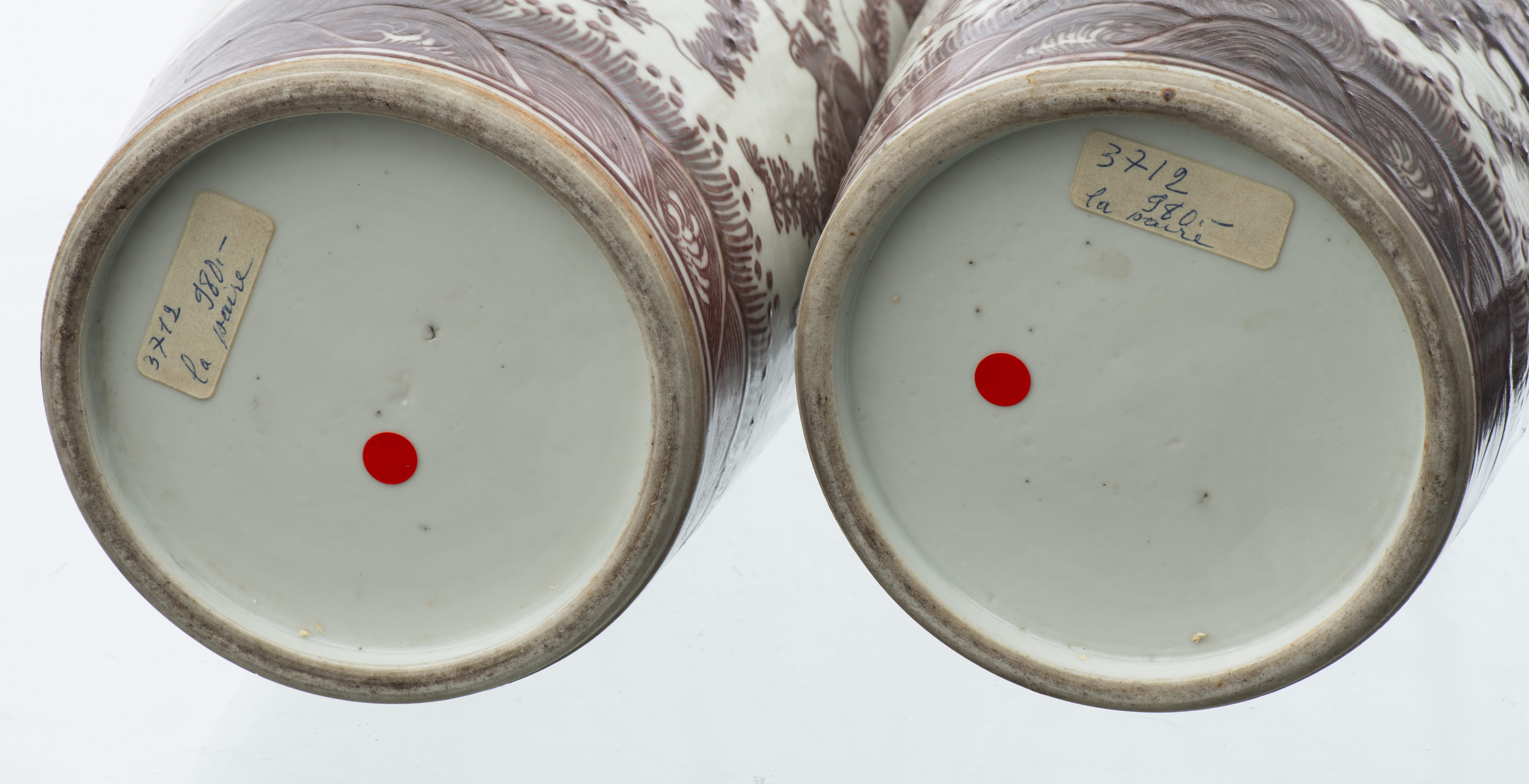 CHINE - Paire de vases rouleaux en porcelaine à décor en rouge de cuivre, fin des Qing