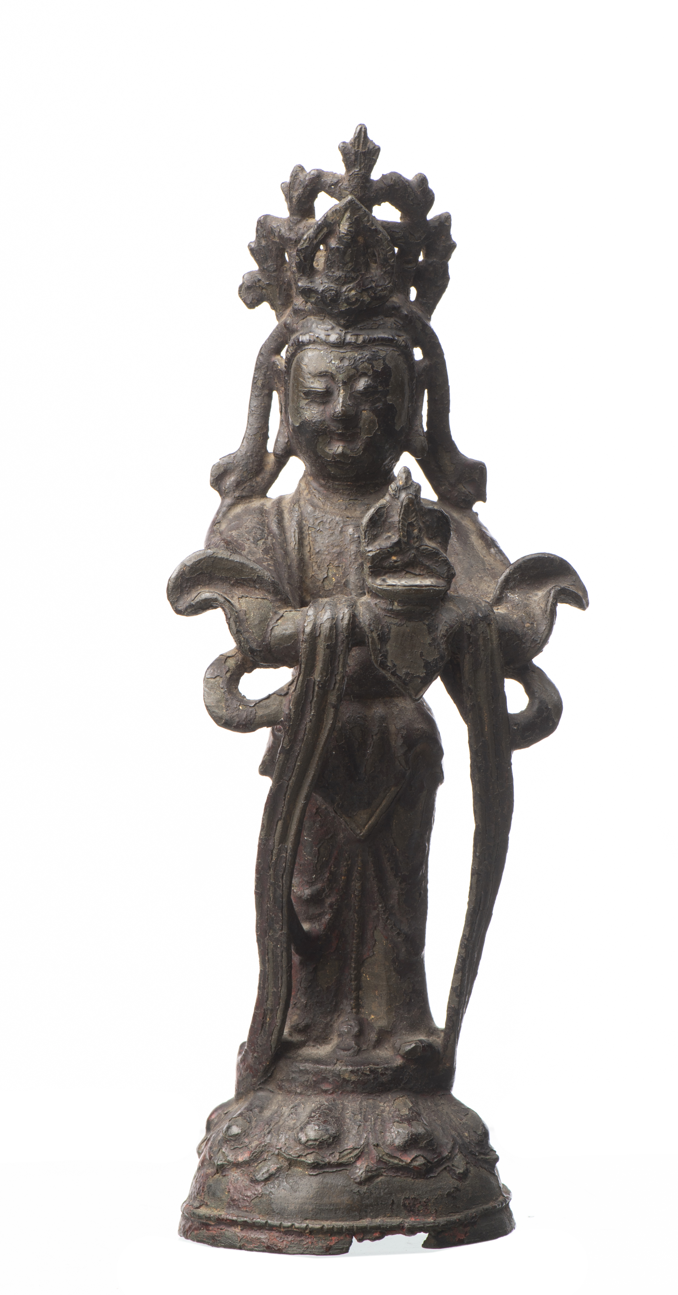 CHINE - Sujet en bronze avec résidus de laque rouge représentant une Guanyin debout portant une offrande. Epoque Ming.