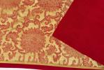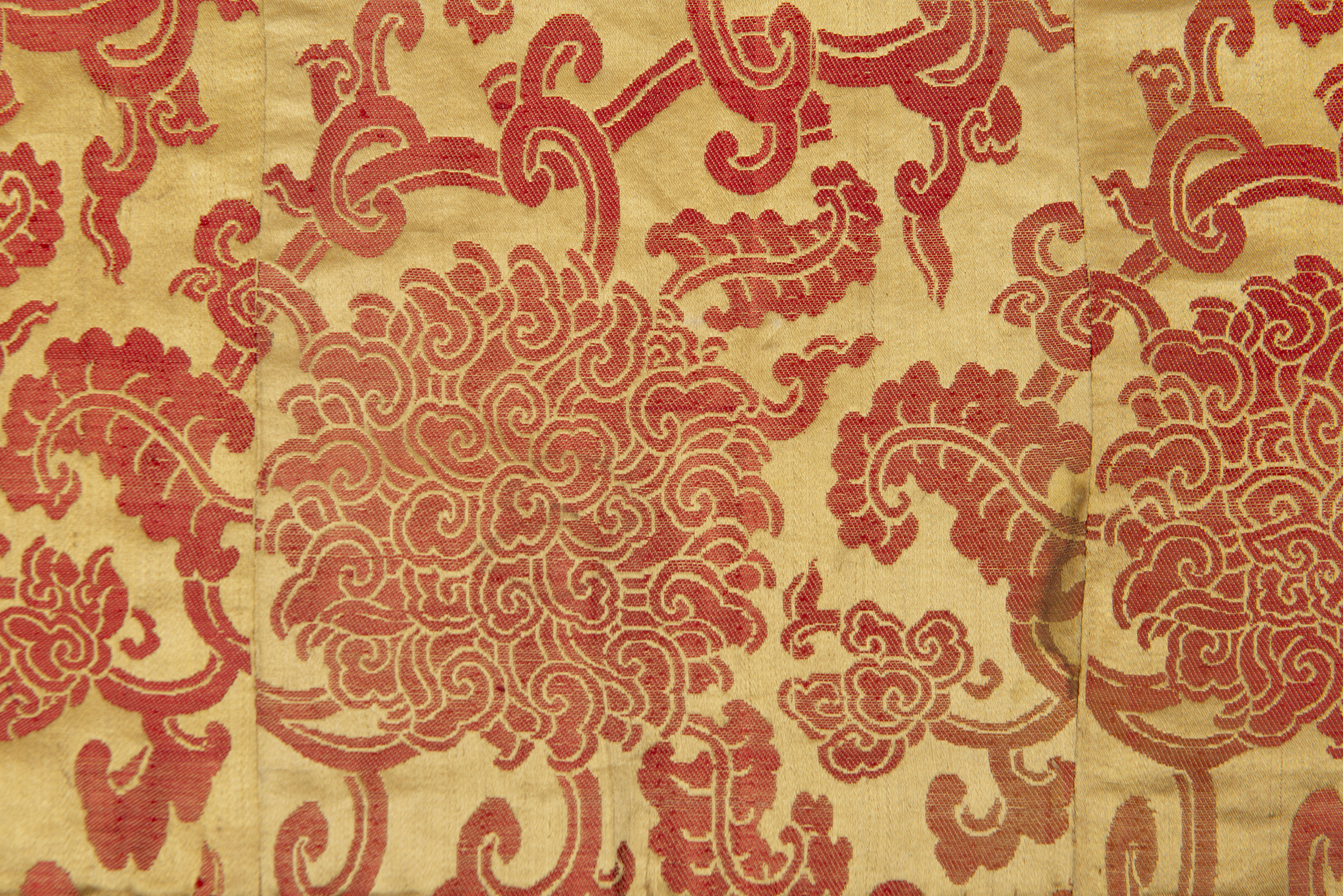CHINE - Brocart de soie rouge et jaune à décor de rinceaux de lotus