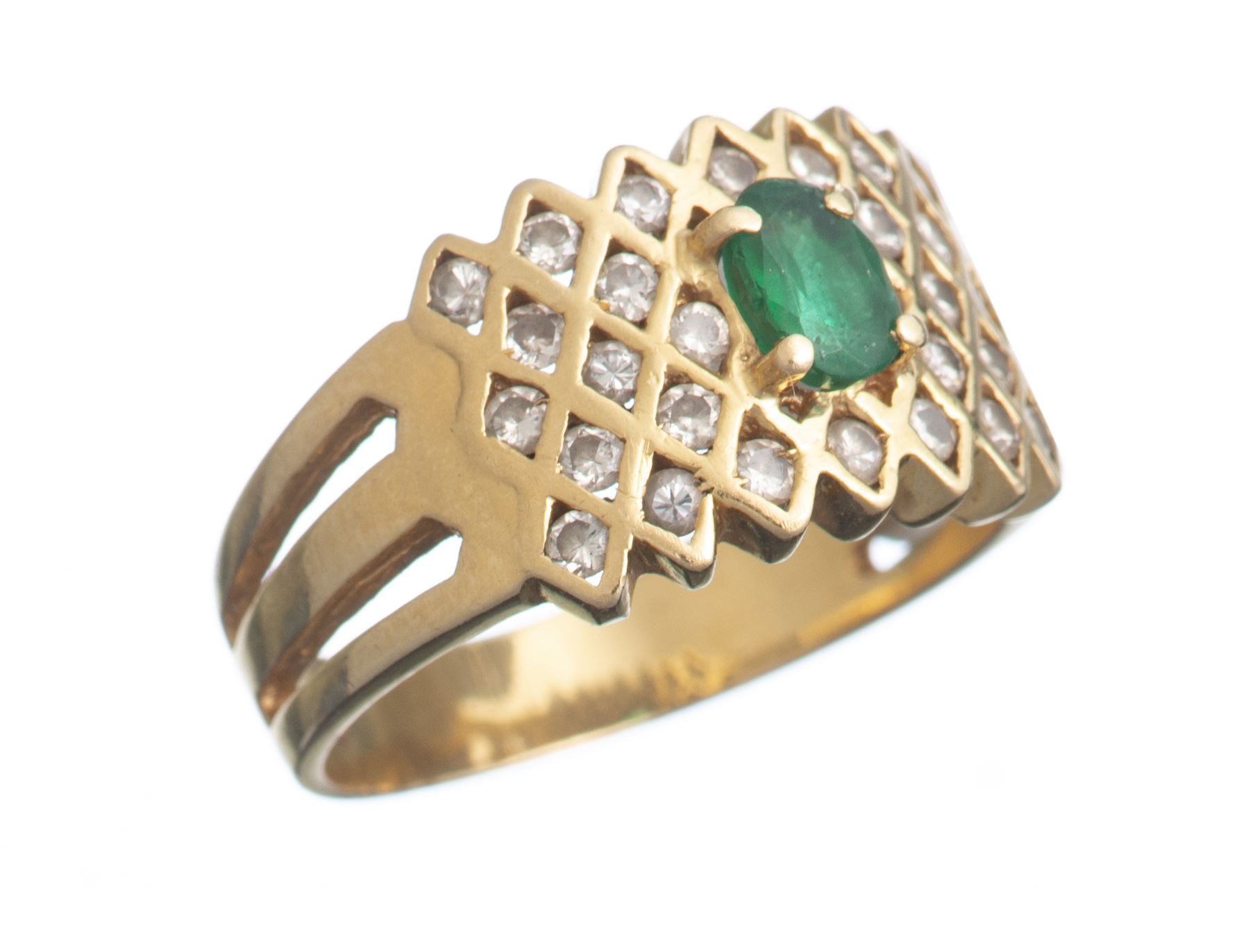 Bague en or jaune .750 sertie au centre d'une émeraude ovale pesant 0.20 ct et 28 diamants de taille brillant en treillis pesant au total 0.15 ct.