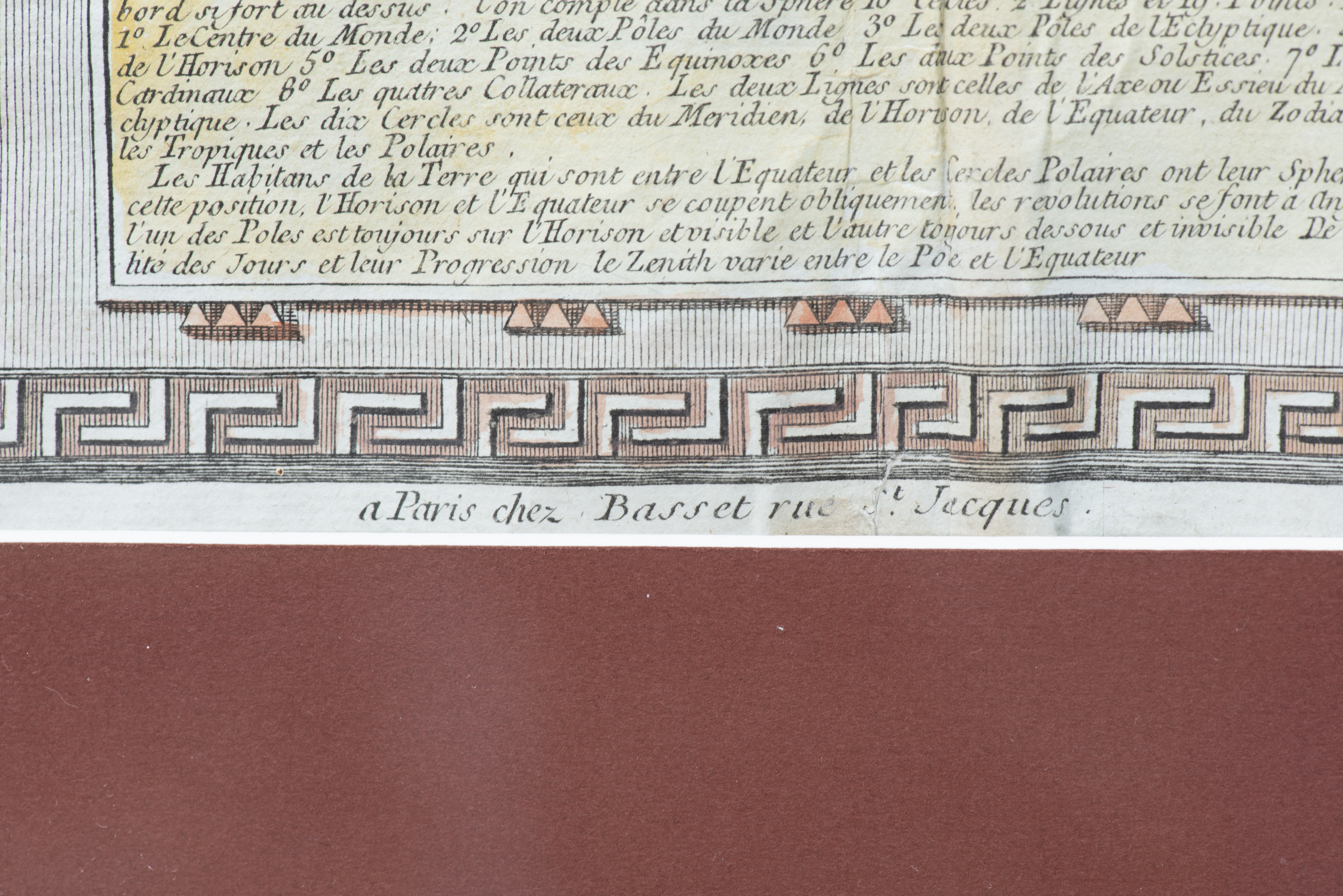Carte géographique (sphère armillaire) ancienne, réhaussée à l'aquarelle, signé en bas à gauche.