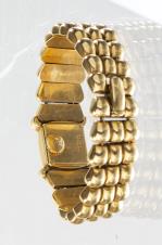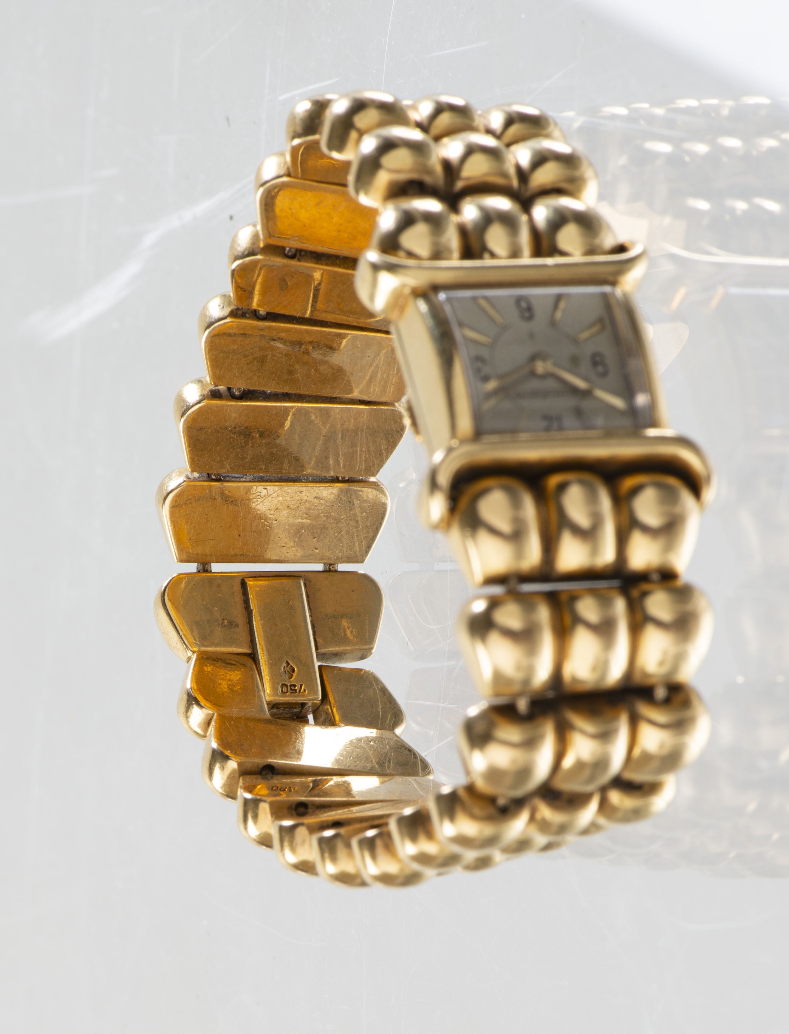 JAEGER LECOULTRE, montre de dame à mouvement mécanique et bracelet en or jaune .750 verre bombé en tonneau, cadran légèrement jaune avec aiguilles et index à chiffres arabes pour les 3-6-9 & 12 h et bâton pour les intermédiaires. Remontoir sous la montre, num. 157018.