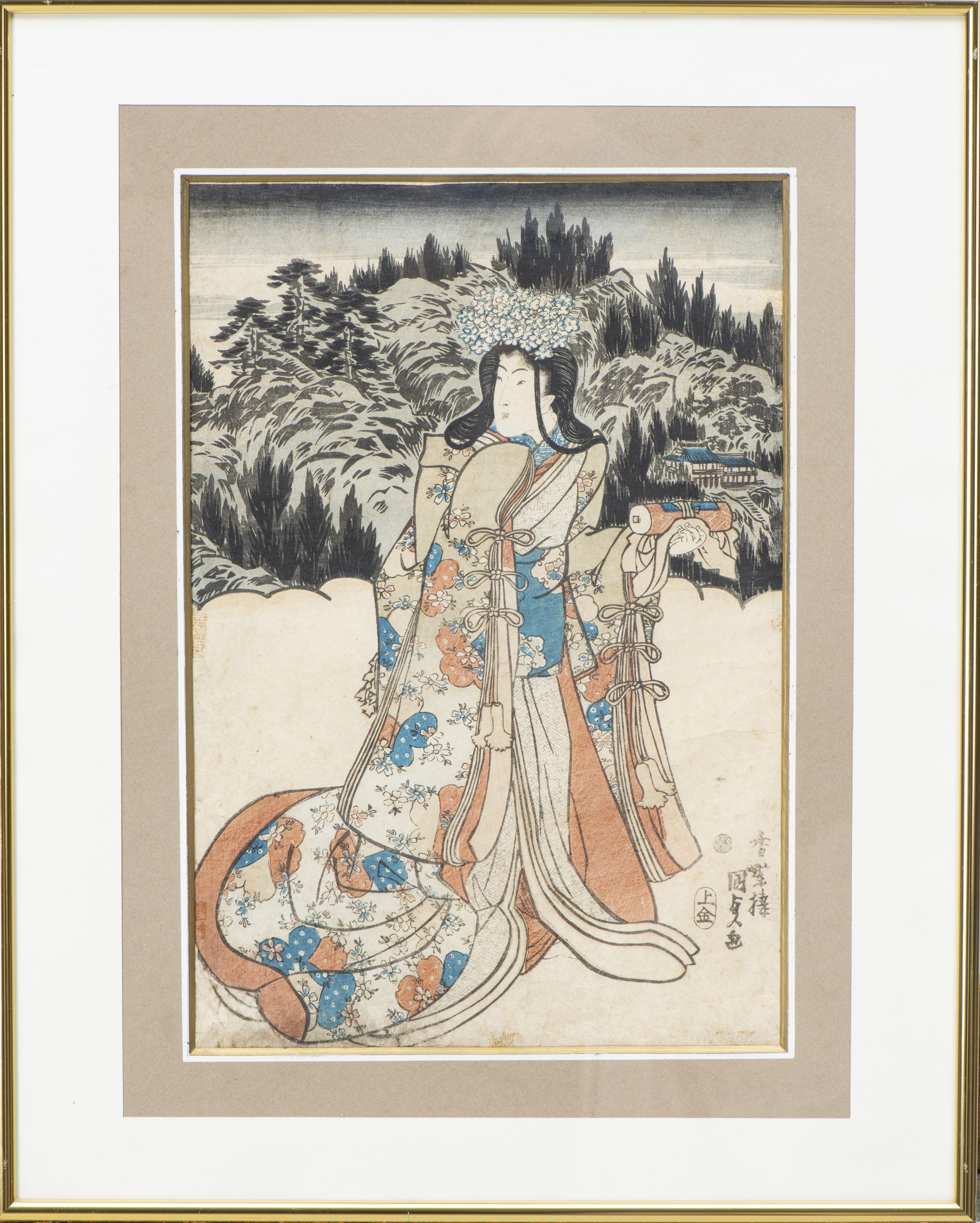 JAPON - Kunisada UTAGAWA (1786-1865), "Courtisane portant un rouleau", estampe