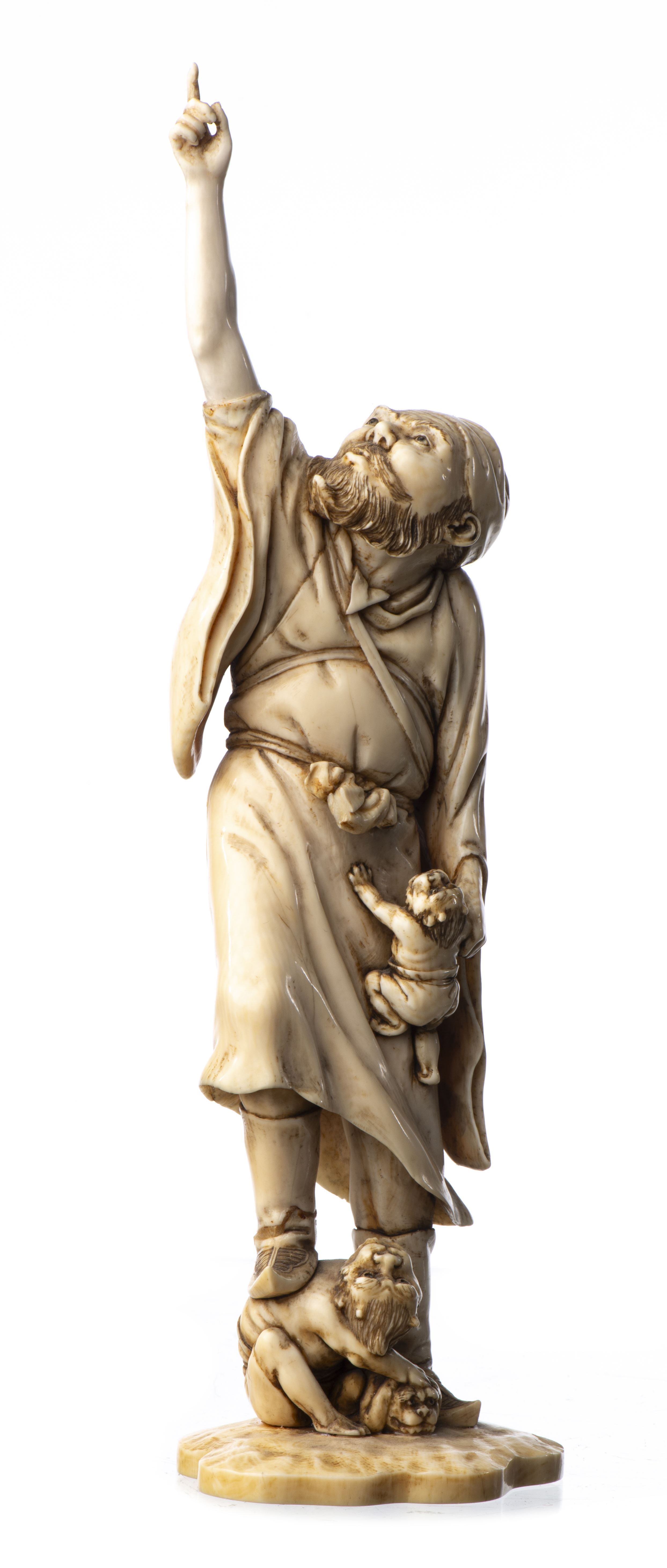 JAPON - Okimono en ivoire représentant un homme, le doigt levé au ciel accompagné de 2 esprits, ère Meiji (1868-1912) signé sous la base de 2 caractères en gris.
