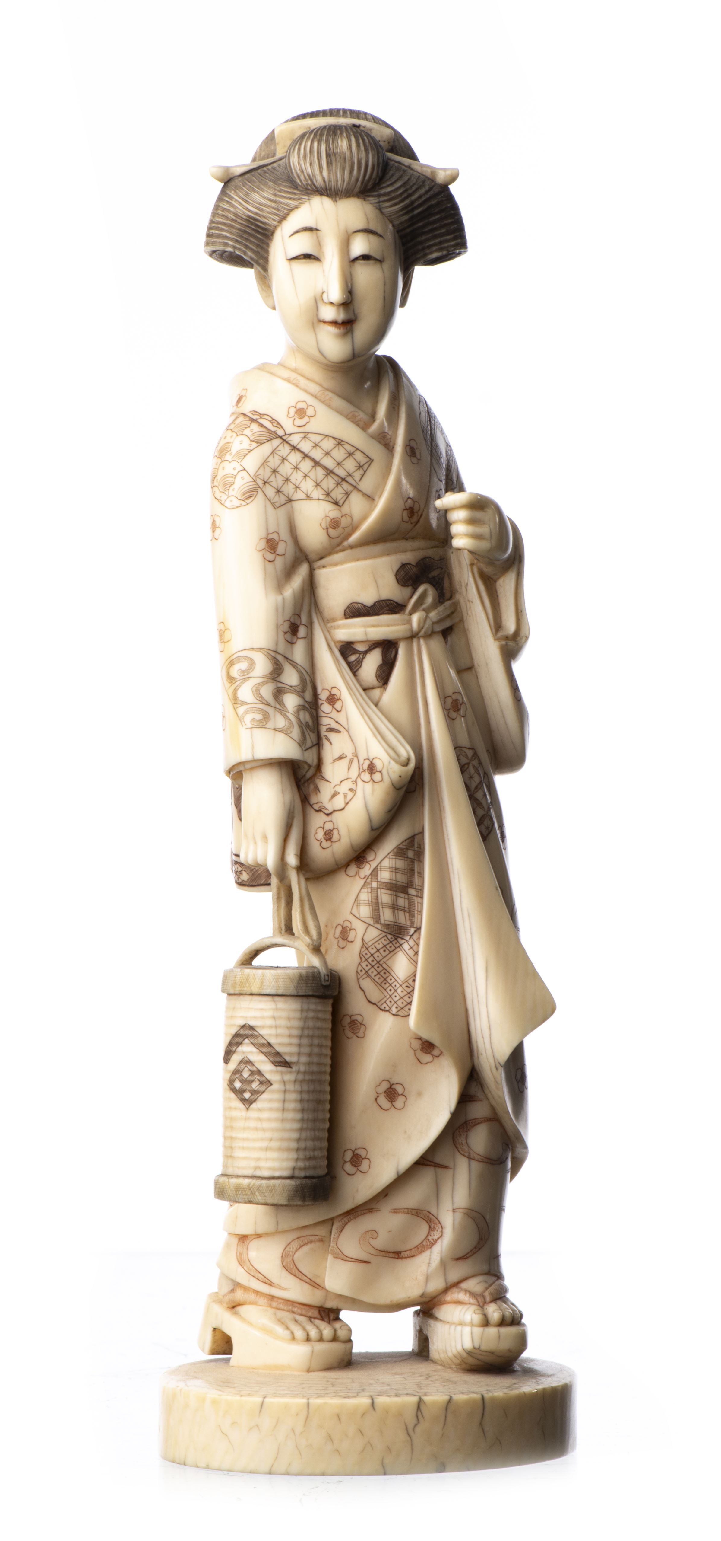JAPON - Okimono en ivoire du Japon représentant une Geisha portant un lampion, ère Meiji (1868-1912) cachet à 2 caractères sous la base.