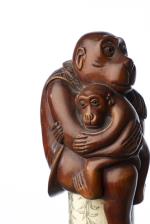 JAPON - Okimono en paire de colonnes en os sumontées d'un singe enlassant sa progéniture