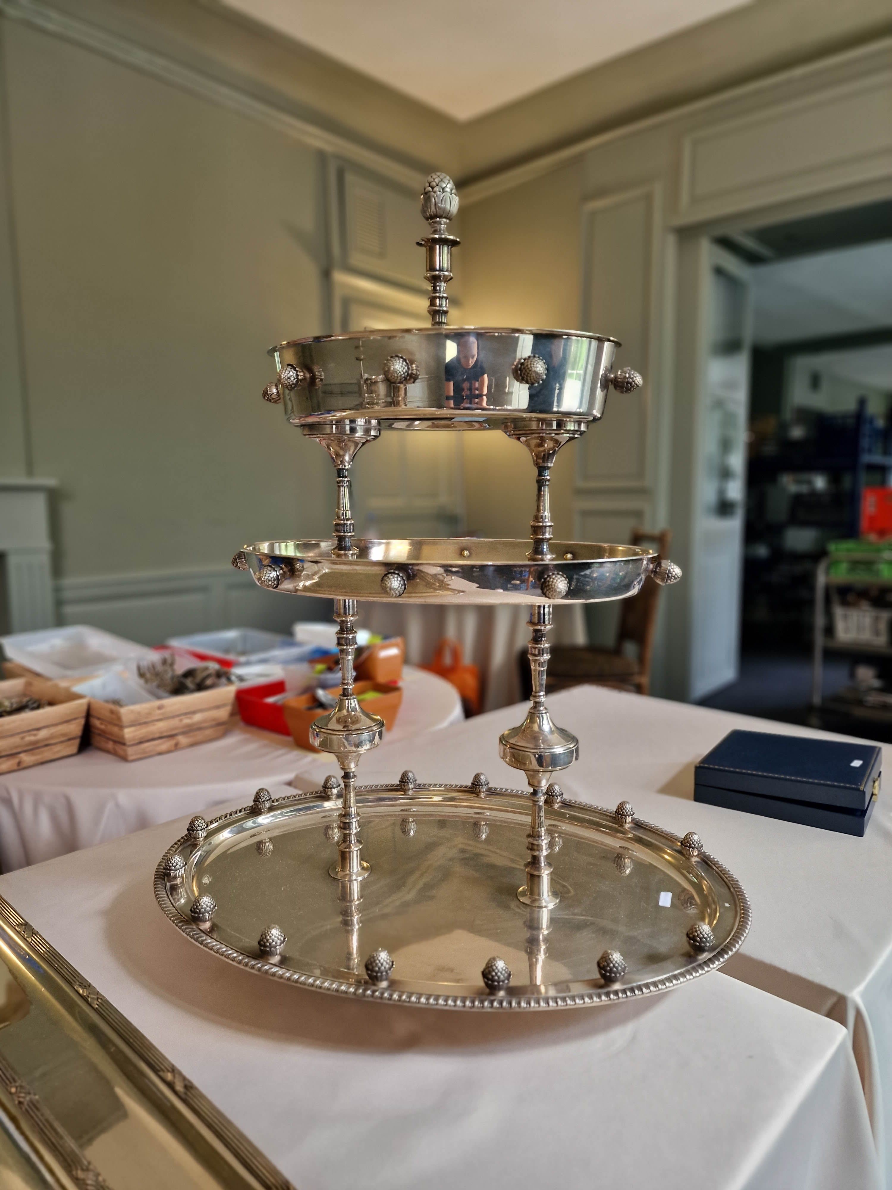 Plat de présentation en métal argenté à trois étages de profondeur diverse. Décor de pommes de pins.