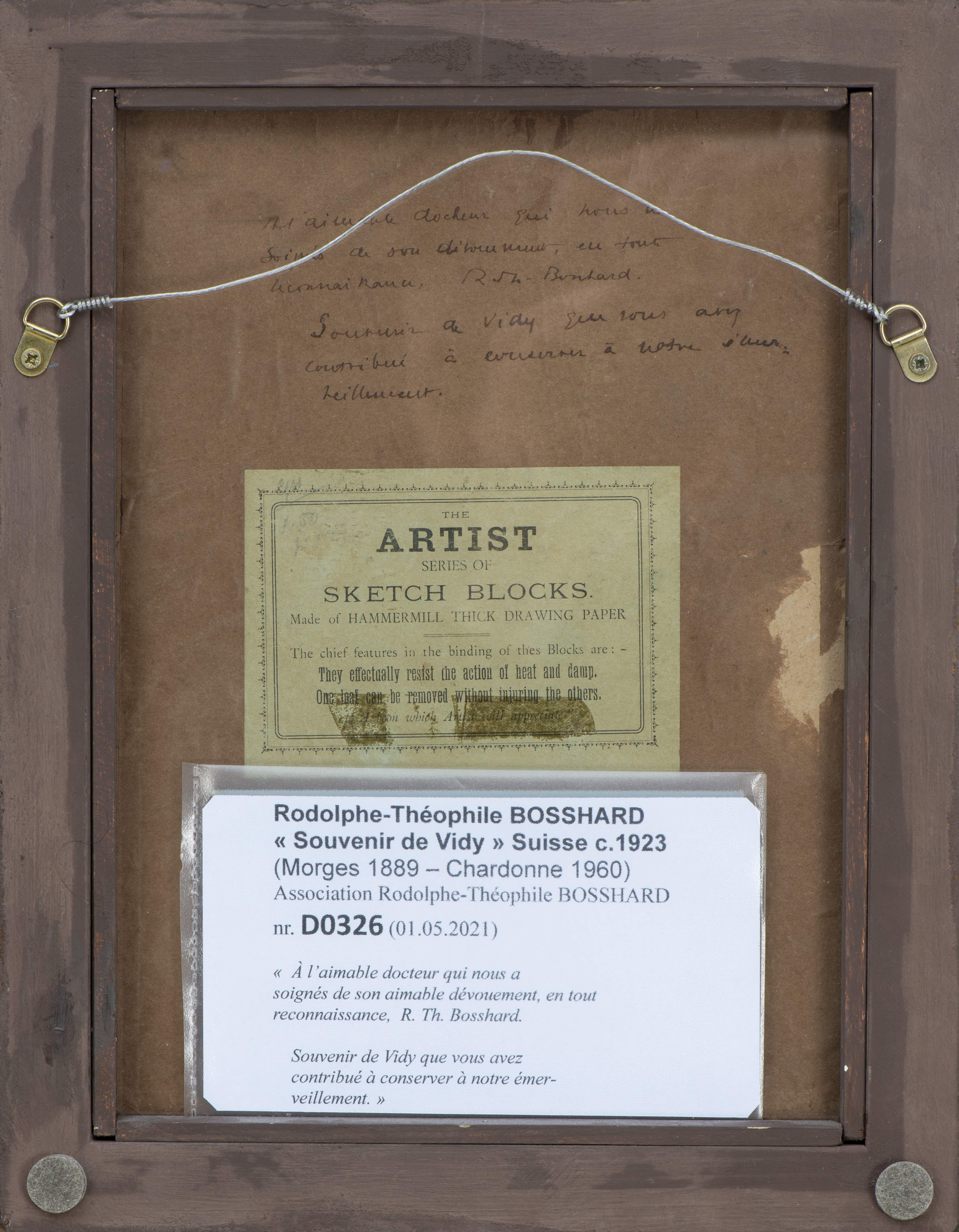 Porte l'inscription au dos: "À l'aimable docteur qui nous a soignés de son aimable dévouement, en toute reconnaissance, R. TH. Bosshard" & "Souvenir de Vidy que vous avez contribué à conserver à notre émerveillement"