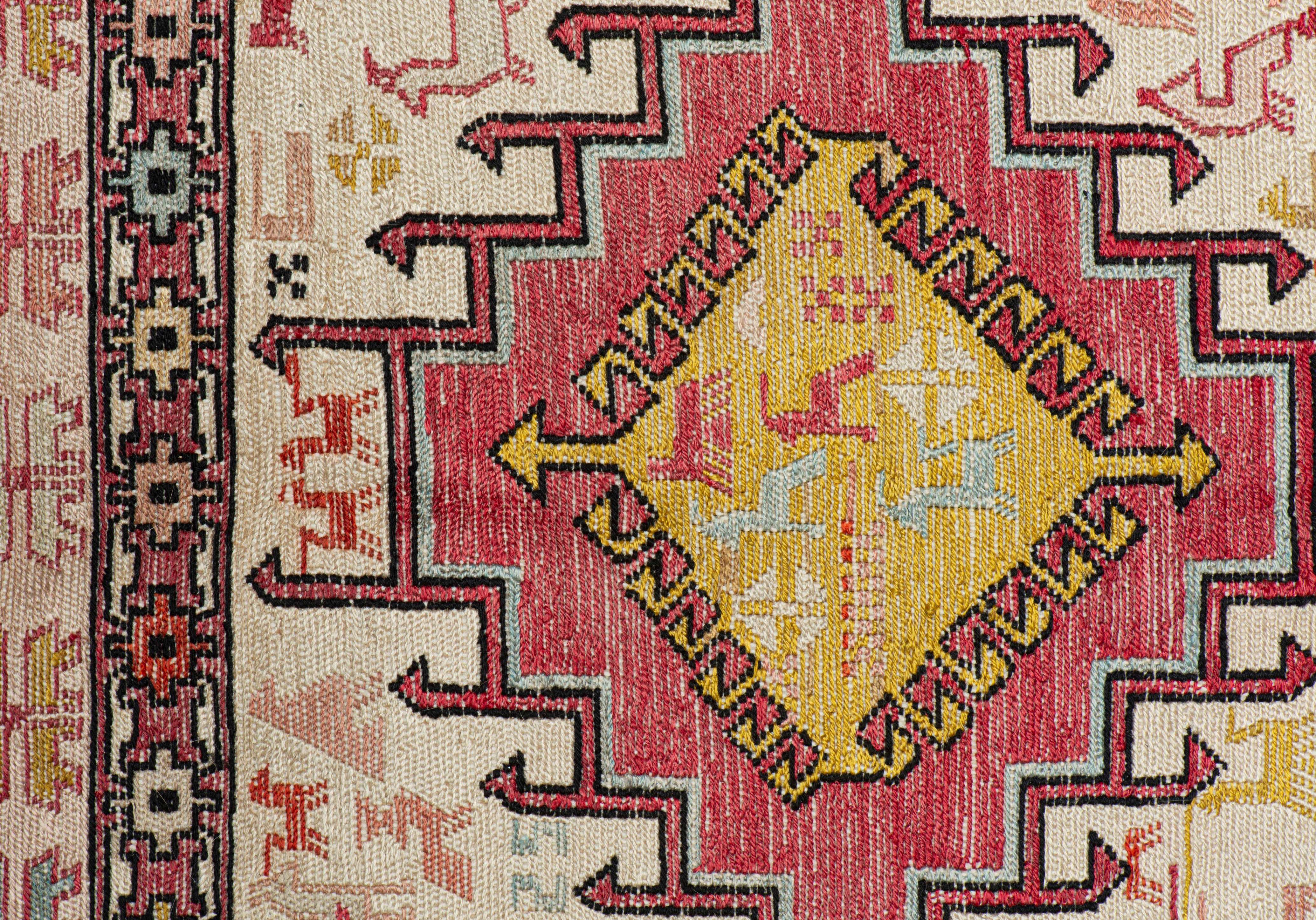 Tapis Soumak en soie et coton tissé main avec décor animalier.