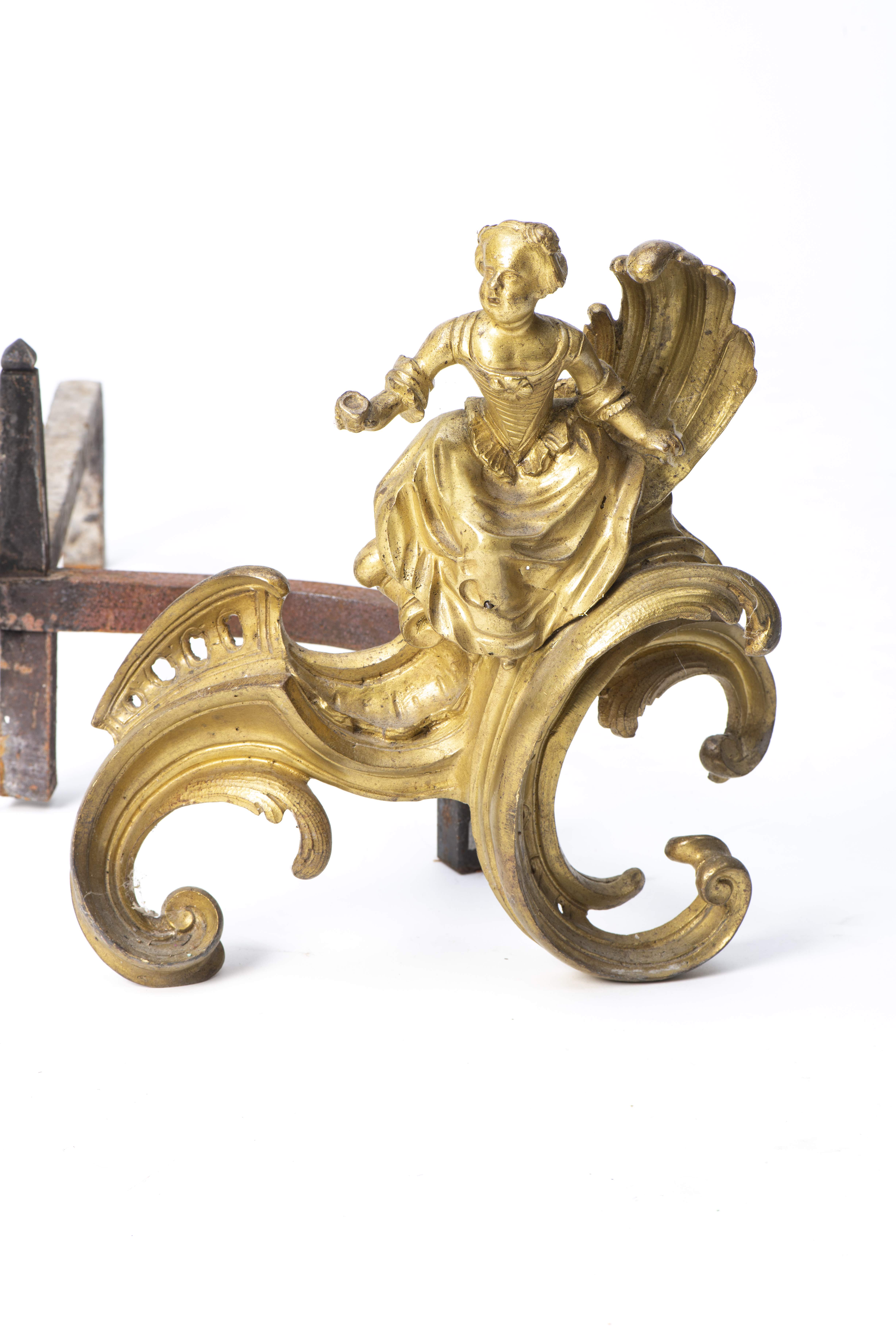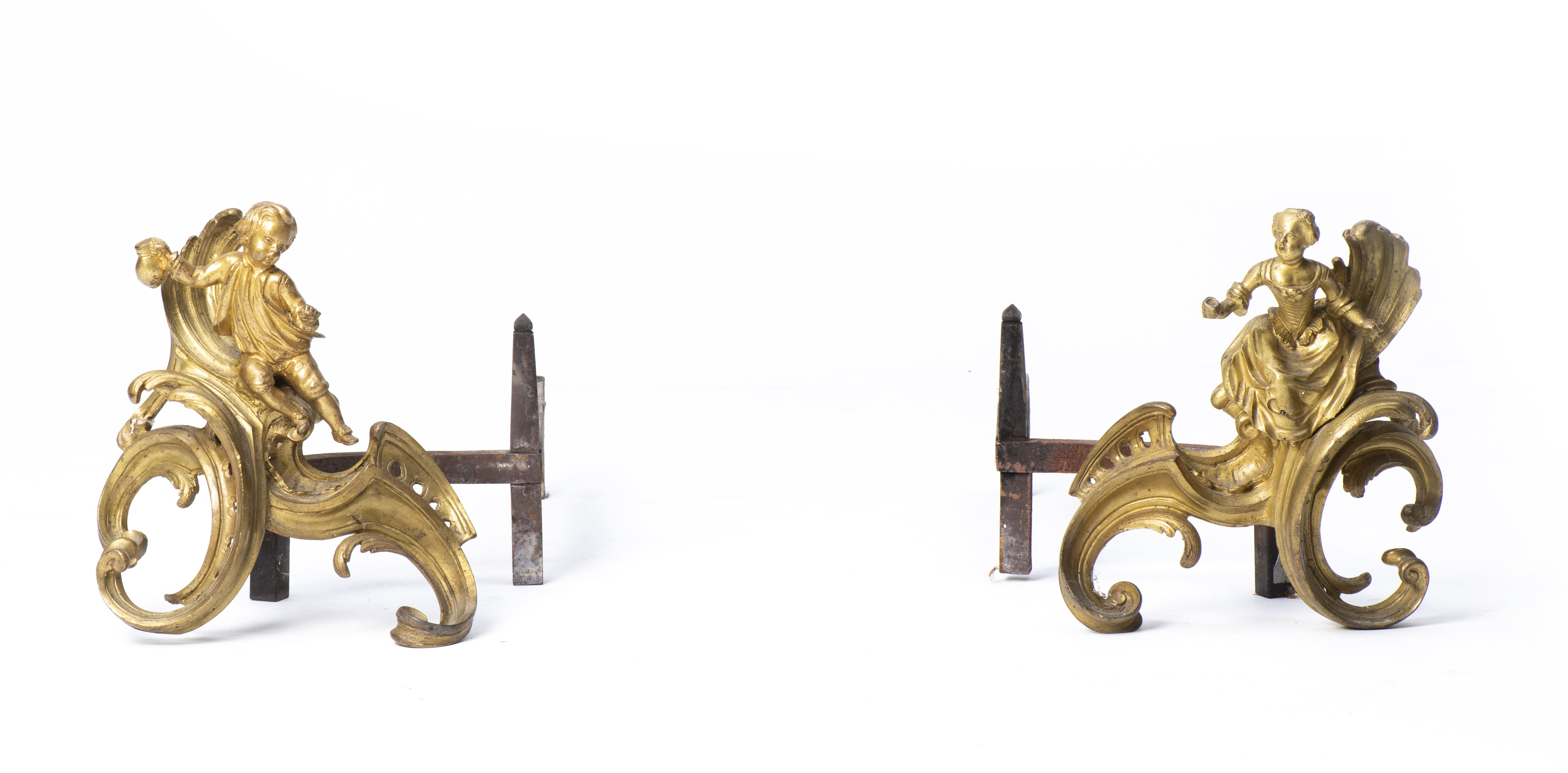 Travail XVIIIe, paire de chenets en bronze ciselé à patine dorée de style rocaille, représentant deux enfants.